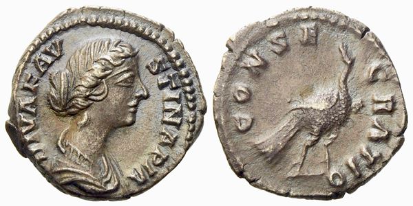 Diva Faustina II, Denarius struck under Marcus Aurelius, Rome, AD 176-180; AR (g 3,19; mm 18,35); DIVA FAVSTINA PIA, draped bust r., Rv. CONSECRATIO, peacock standing r., head turned back. RIC 744; C 71. Good extremely fine.