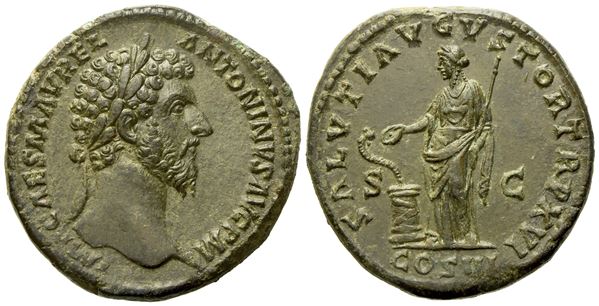 Marcus Aurelius (161-180), Sestertius, Rome, AD 163; Æ (g 25,44; mm 32); IMP CAES M AVREL - ANTONINVS AVG P M, laureate head r., Rv. SALVTI AVGVSTOR TR P XVI, Salus standing l., feeding serpent rising from altar out of patera and holding sceptre; in field, S - C; in ex. COS III. RIC 843; C 564. Grey-green patina; expressive portrait; possible slight traces of old cleaning; good extremely fine / about Fdc.
