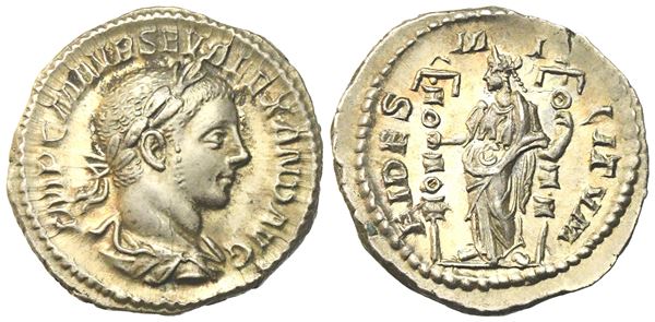 Severus Alexander (222-235), Denarius, Rome, AD 222-228; AR (g 2,88; mm 19); IMP C M AVR SEV ALEXAND AVG, laureate, draped bust r. / FIDES M-I-LITVM, Fides standing left, holding two standards. RIC 139; C 52. Good extremely fine / about Fdc.