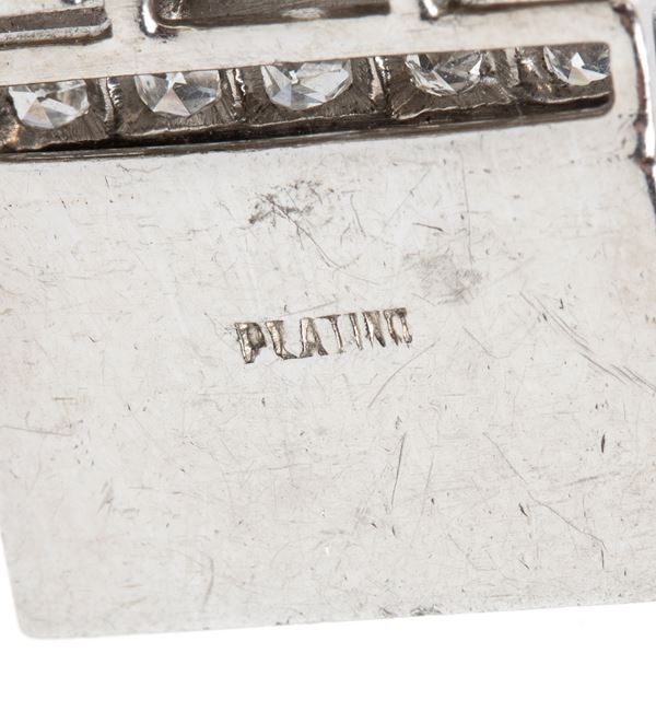 geometrically-patterned platinum setting embellished with diamonds and a central emerald. Hidden clasp.