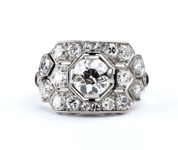 geometrical cocktail ring set in platinum, the central old european cut diamond is surrounded by decoratively positioned smaller diamonds set in a honeycomb fashion.