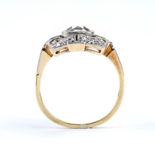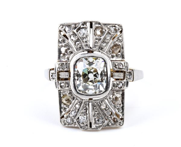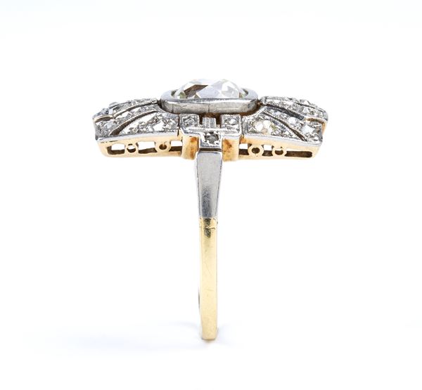 especially nice geometrical cocktail ring set in platinum and 14k yellow gold; the central diamond of cushion shape, old european cut, approx. 1.60 ct, is surrounded by decoratively positioned smaller rose cut diamonds.