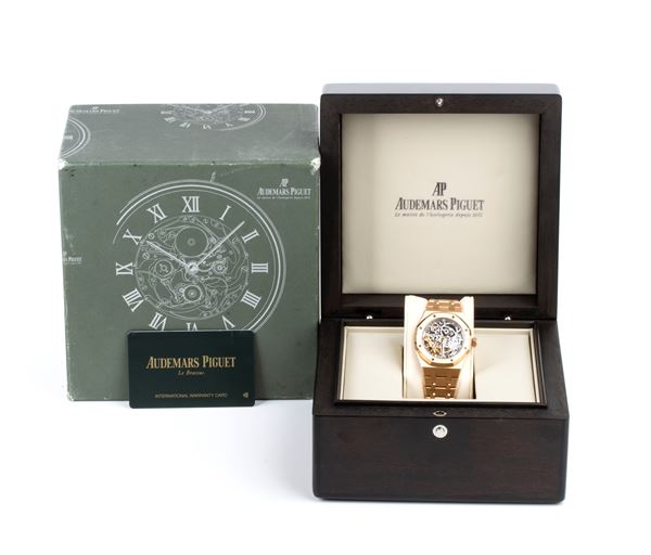 18k rose gold case and bracelet, skeletonized, with visible automatic mechanical movement, double balance with gold oscillating weight, finely worked.