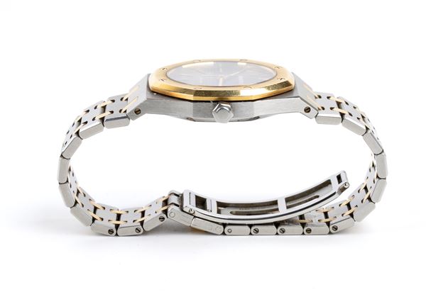 steel and 18k yellow gold case and bracelet, classic Royal Oak dial with gold-plated hour markers and hands, date window at 3 o'clock. Automatic mechanical movement with 21k gold oscillating weight.