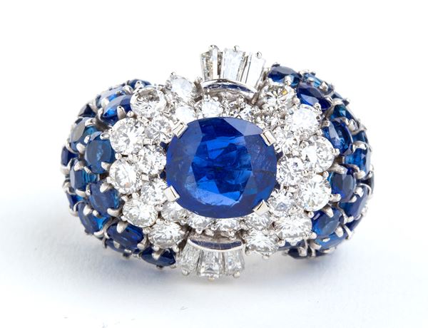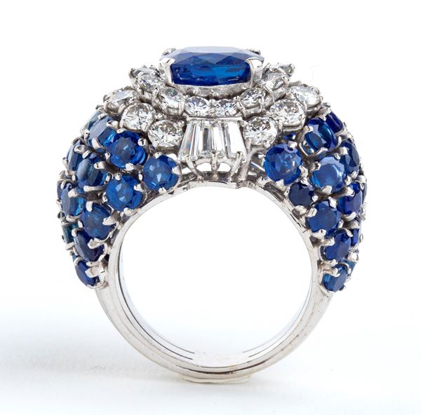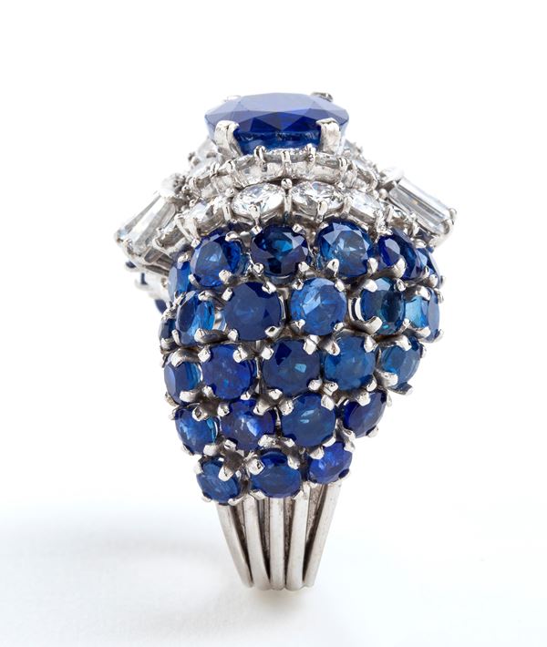 18k white gold, set with oval blue sapphire, approx. 3.38 ct, origin Burma, framed by round brilliant cut and tapered diamonds approx. 3.00 ct, E-F, IF-VVS. Sides of frame decorated with pave set sapphiresapprox. 9.00 ct.