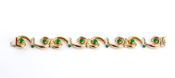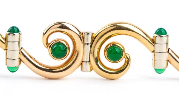 spiral shaped setting in 18k white and yellow gold embellished by emerald cabochons cut chrysoprase.