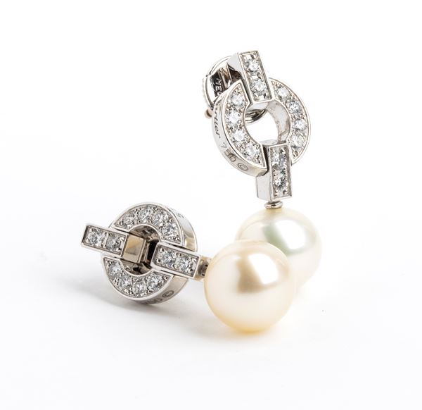 18k white gold earrings, set to the centre with an openwork circular motif, each set with 12 round brilliant cut diamonds. Suspended from the circular motif is a single round saltwater cultured pearl.