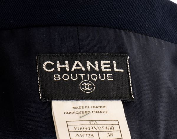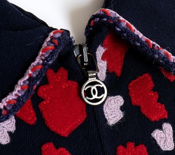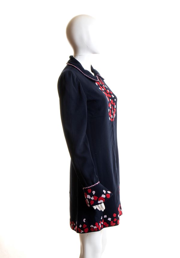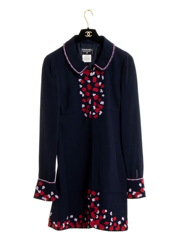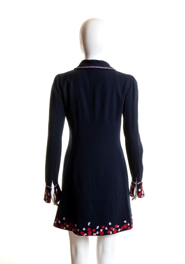 Chanel dark blue wool and silk dress with logo buttons, decorated with embroidered motifs both on the sleeves and on the lower and upper parts of the dress.