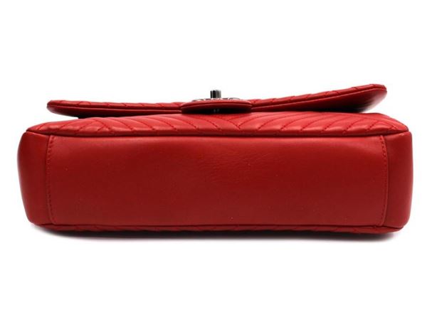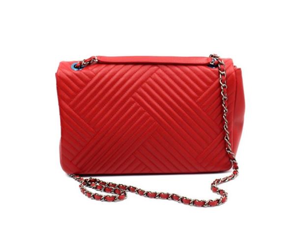 Chanel Crossing Flap Red Chevron Lamb Leather shoulder bag, with silver chain, front flap with snap closure Chanel CC in silver.