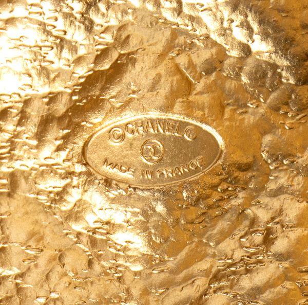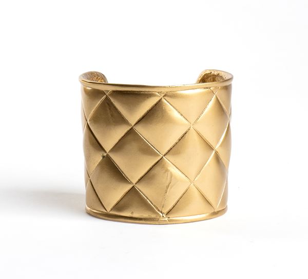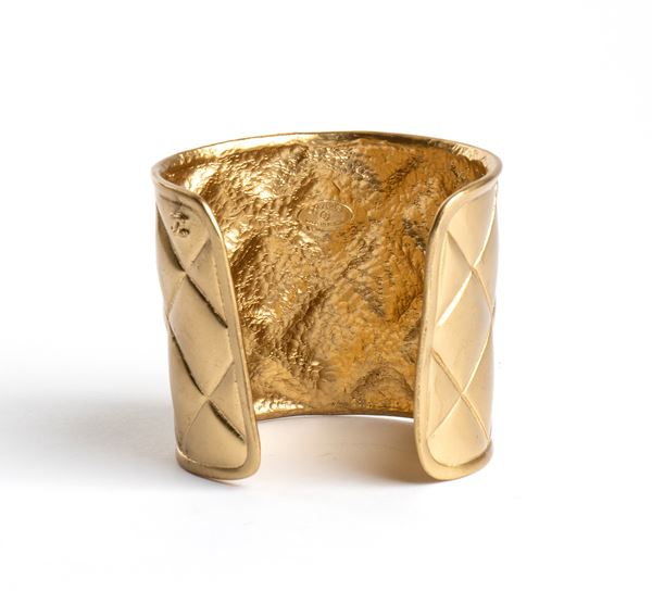 Chanel Manchette model bracelet in quilted leather-effect golden metal with cc logo on the upper part of the bracelet.