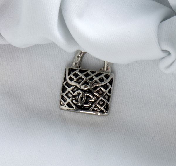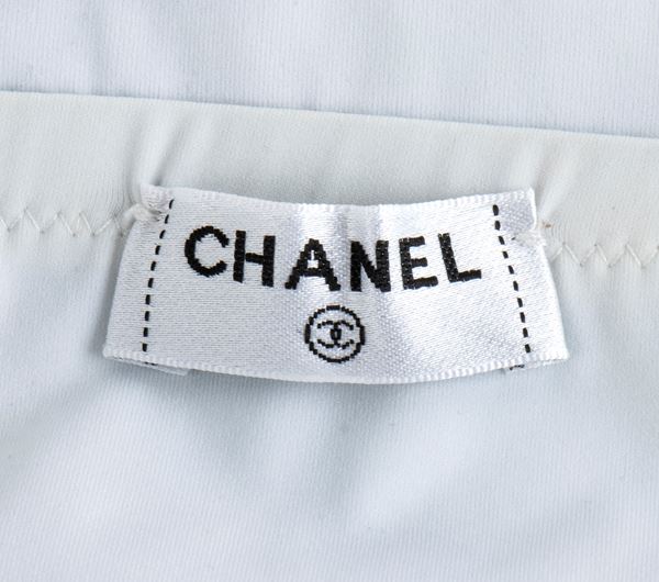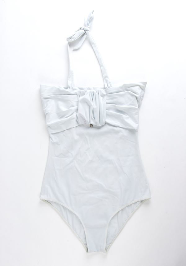 Chanel ice white one-piece swimsuit, with CC logo on the charm.
