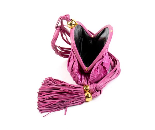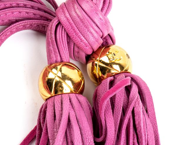 Chanel vintage pink satin shoulder bag, with black leather interior, gold-colored hardware, the bag has a long pink leather shoulder strap.