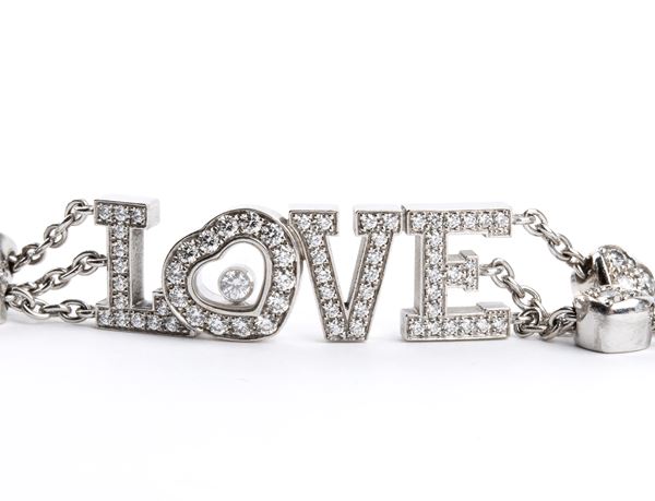 18k white gold, the choice of white gold amplifies the brilliance of the pave set diamonds, decorating the heart of the bracelet with the iconic "Love" motif flanked by small hearts.