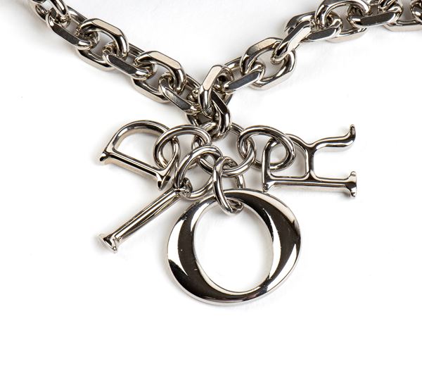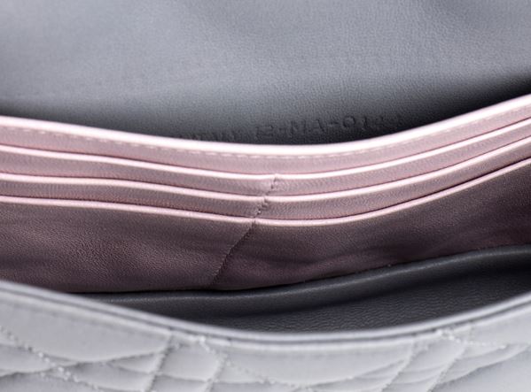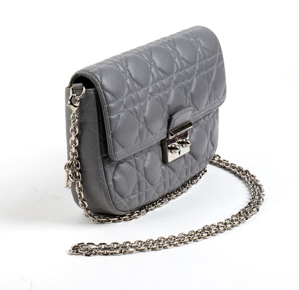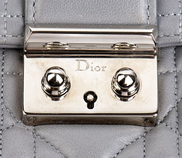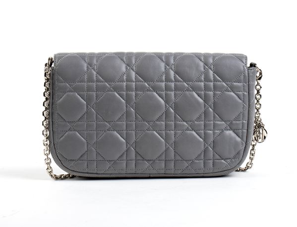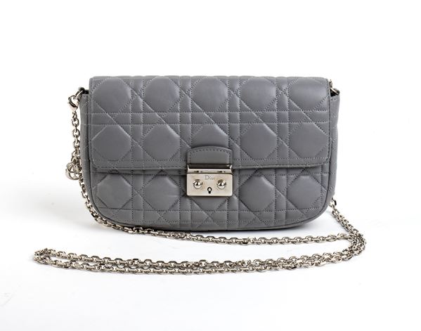 Dior Miss Dior Promenade bag in gray cannage leather, silver metal front, snap opening, pink leather interior, flat pockets.