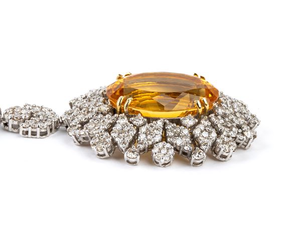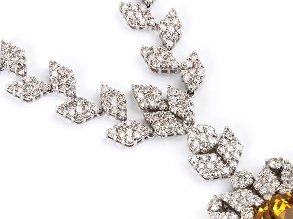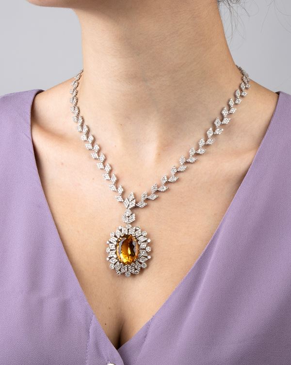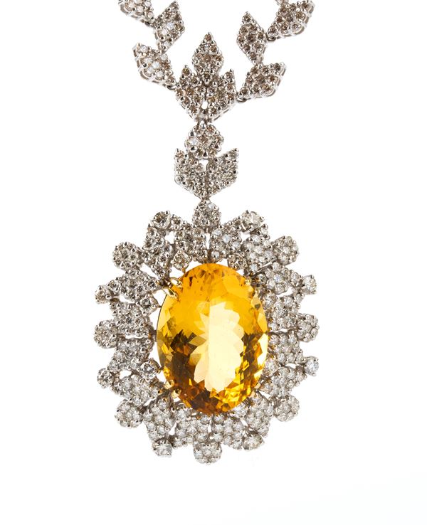 white and yellow gold, diamond pavé set leaf motif chain and pendant set with citrine quartz between diamond frames.