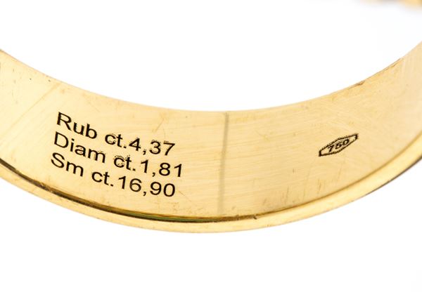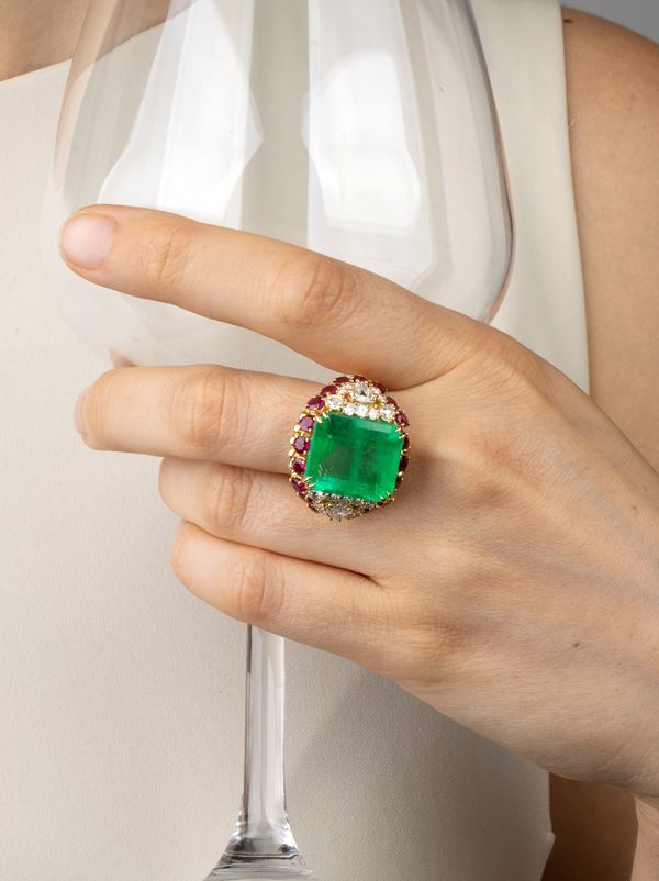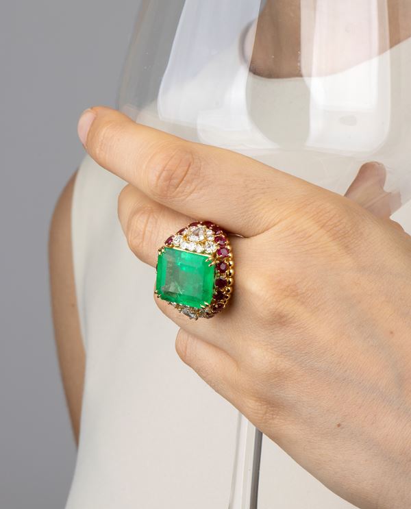 18k yellow gold, set with emerald surrounded by rubies and flanked by diamonds.
