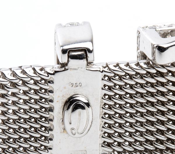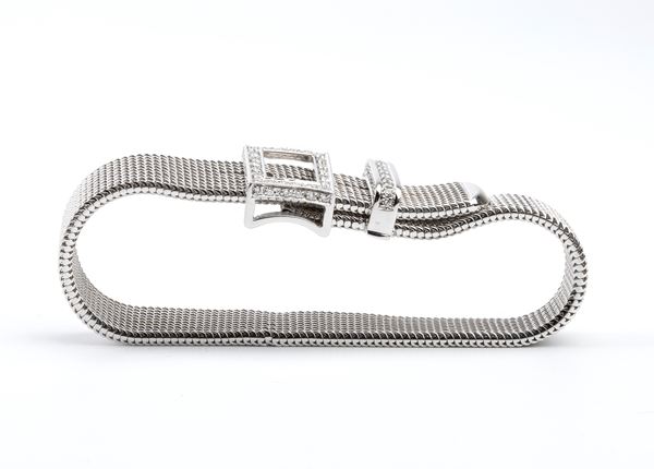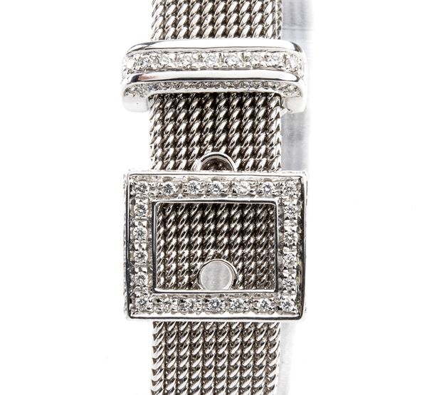 18k white gold flexible band, buckle motif with diamond details.