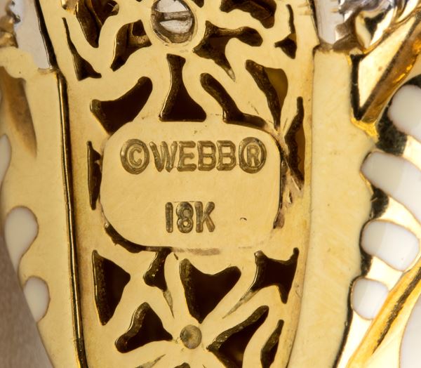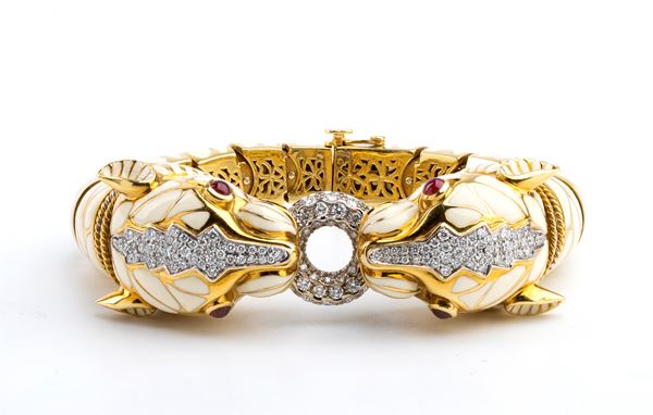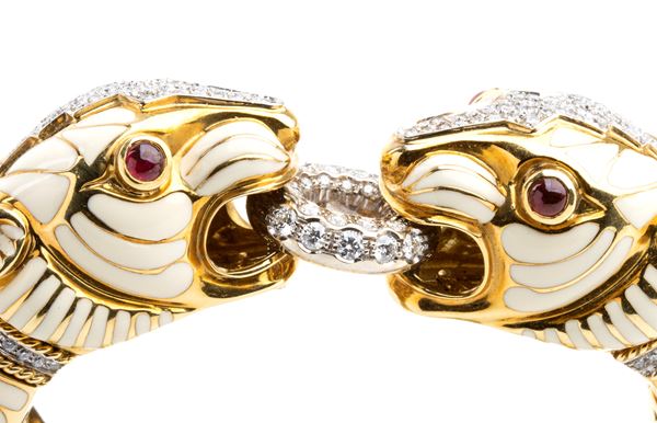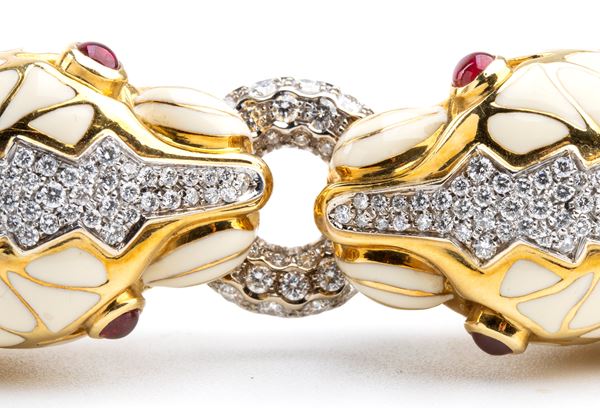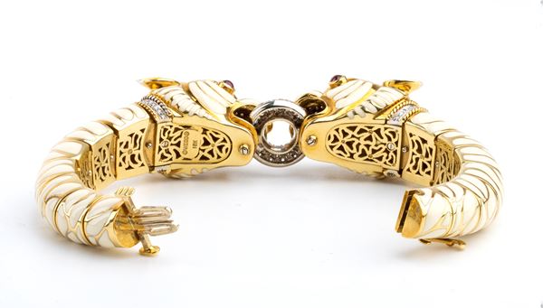 18k yellow gold, with a pair of facing white tiger heads, eyes in small rubies, central ring and tiger's heads accented with pavé set diamonds, body decorated with white enamel applied using the champlevé technique. The bracelet, oval shape, is semi-rigid due to its enamelled jointed links that give it a fluid movement, recalling the movement of the animal. The clasp is concealed with a safety hook.