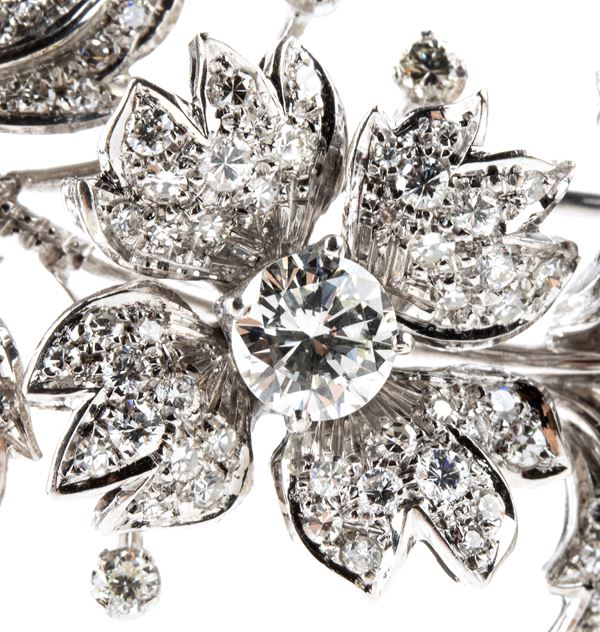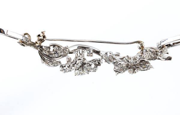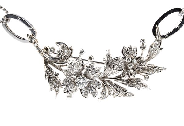 18k white gold Pendant-brooch with flowery shoot motif highlighted by diamonds.