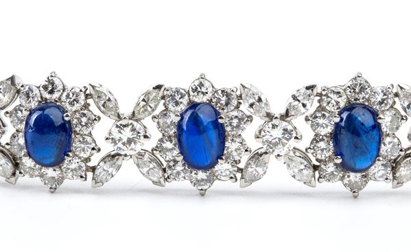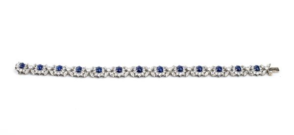 platinum bracelet featuring 13 blue sapphire and diamonds cluster setting separated by articulated diamond set flowers.