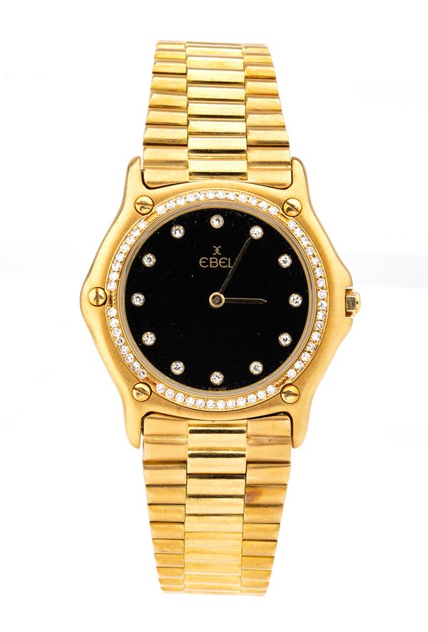 18k yellow gold bracelet, diamonds bezel, index diamonds, black dial, commercial gold bracelet. Quartz movement.