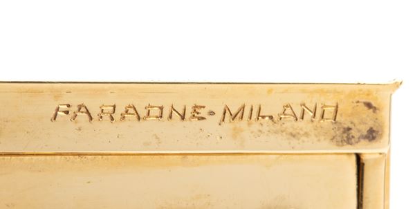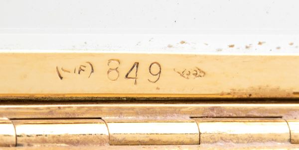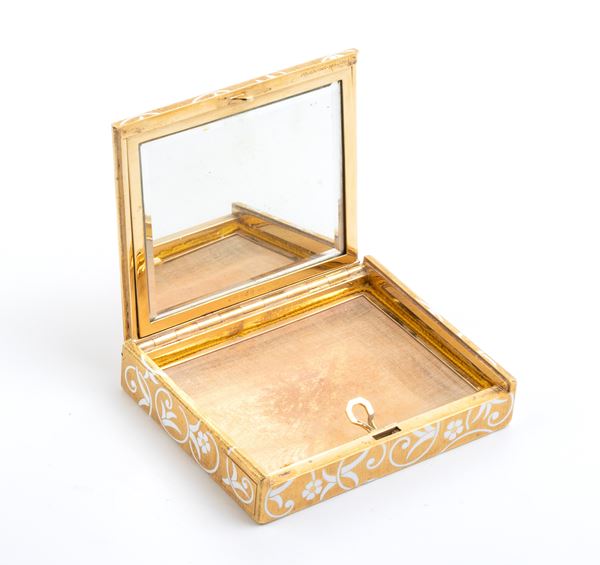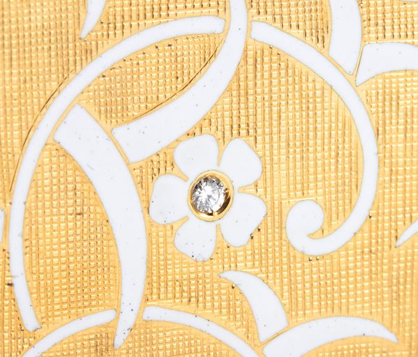 18k yellow gold, satin motif, rectangular shape, with a satin finish, decorated with a white enamel ramage and floral motif, highlighted by diamonds. With interior mirror.