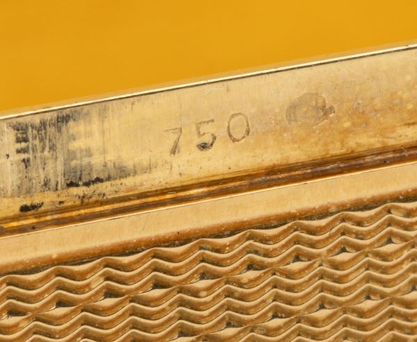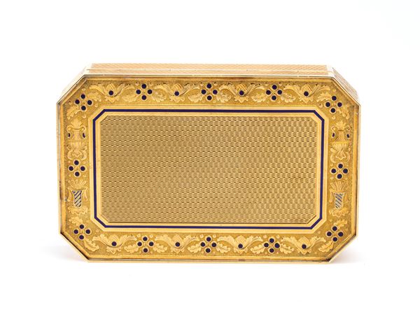 18k yellow gold, rectangular in shape with chamfered corners and hinged lid, finely guilloché engraved with floral motifs and decorated with blue enamel.