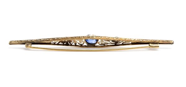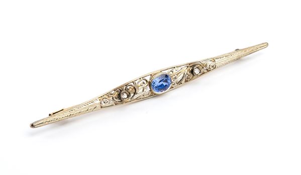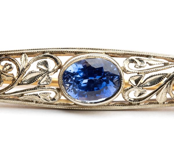 gold and silver, openwork with motifs of branches and leaves, embellished with a synthetic sapphire