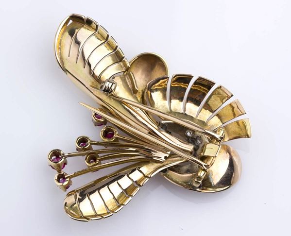Gold brooch with rubies and diamonds, 1940s