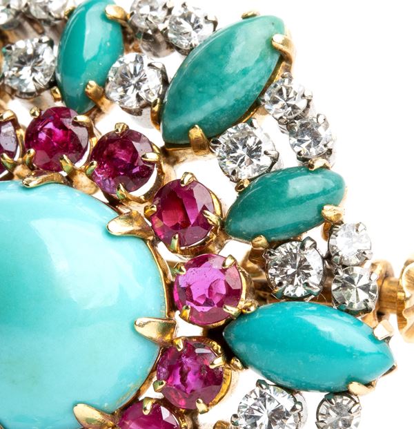 yellow and white gold, rosone motif embellished by turquoise cabochons, rubies and highlighted by diamonds.
