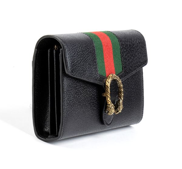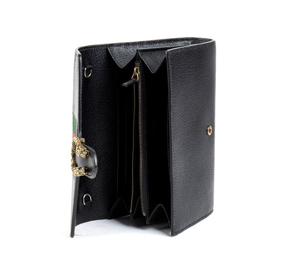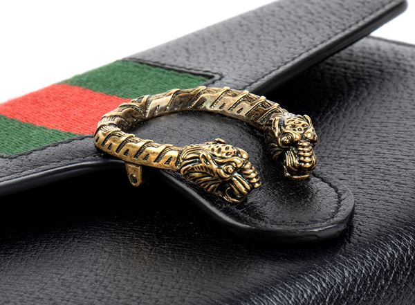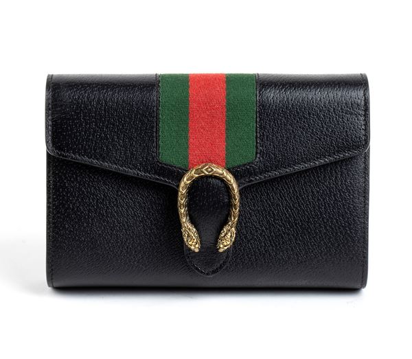 Dionysus Gucci shoulder bag in black leather, with green and red web band, metal tiger head closure, removable chain shoulder strap with the possibility of carrying it as a clutch.