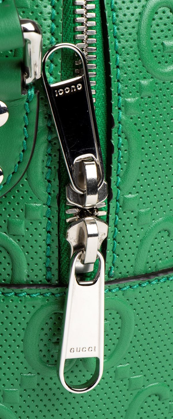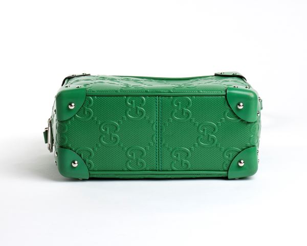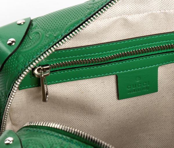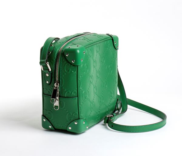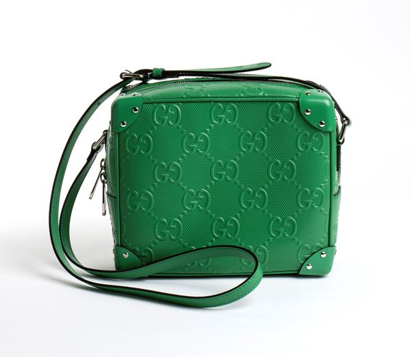 Gucci Messenger bag in green leather with GG in relief, beige interior.