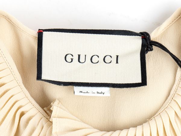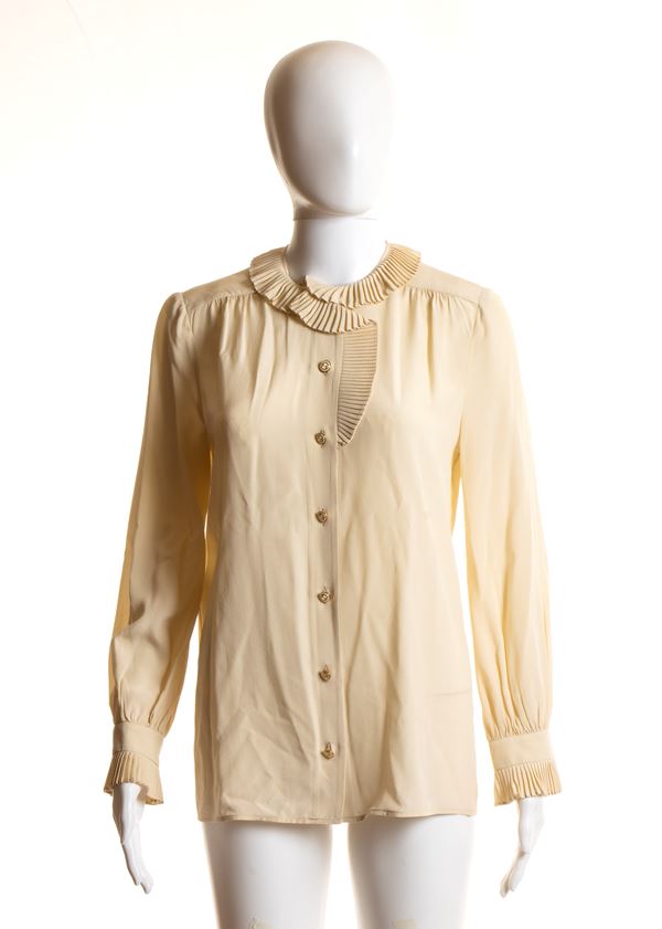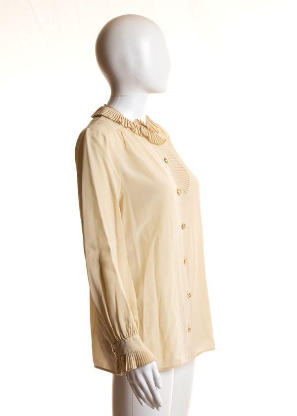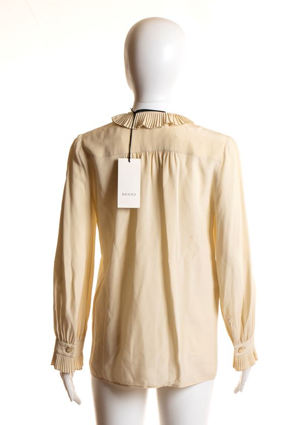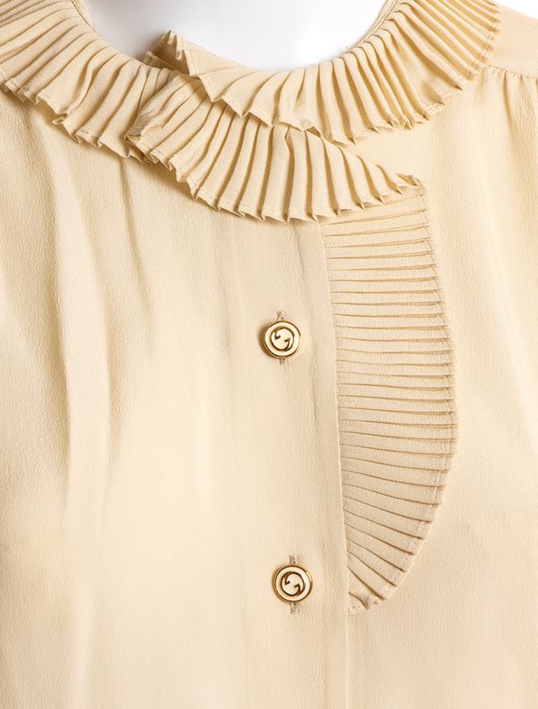 Gucci powder-colored silk shirt with logoed buttons with particular ruffle-effect closure.