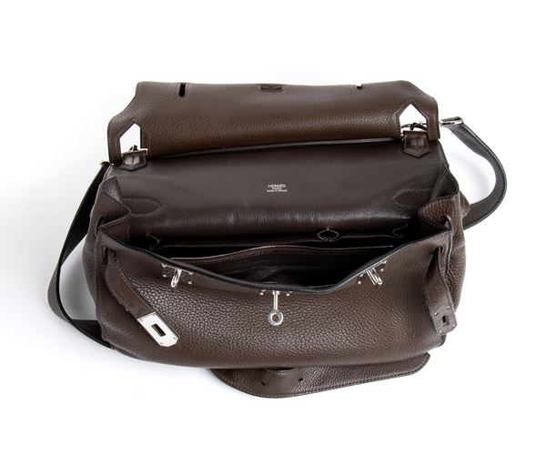 Hermès Jypsiere 34 made of brown togo leather, front flap closure and clasps in the center with palladium inserts, a large internal zip pocket and two open pockets for cell phones and small objects, It features a shoulder strap designed with comfort in mind as it is adjustable and incorporated with a shoulder pad.