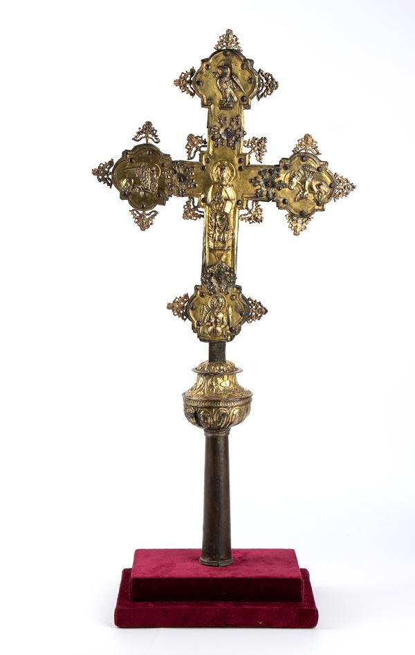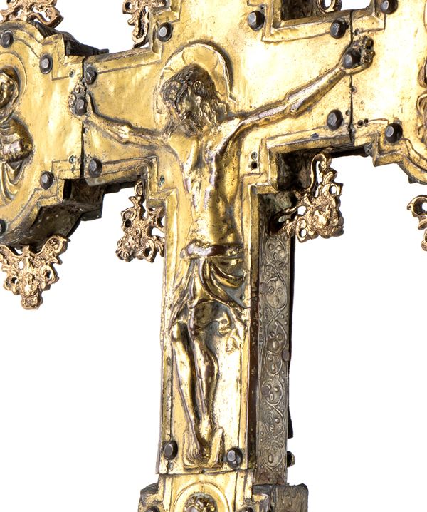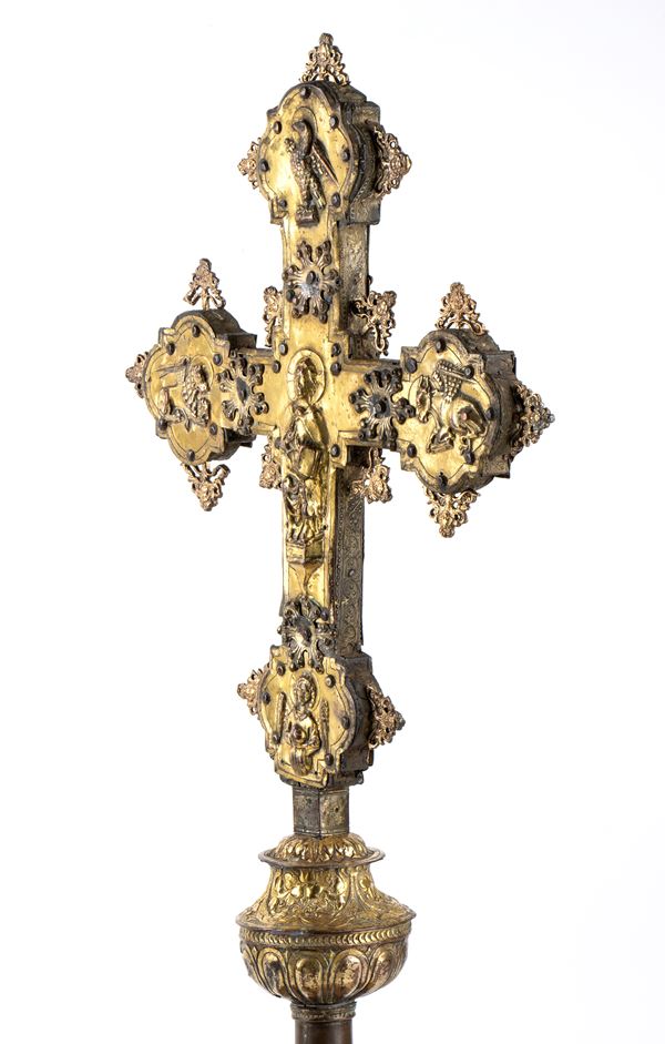 made of embossed, chiselled and gilded copper foil on a wooden core, it has a Latin cross structure with the arms with poly-lobed finials; the rib is also covered by sheets with moulded ornaments depicting whirls with acorns.