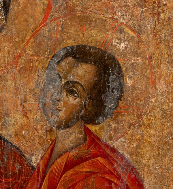 The Virgin retains the solemnity that characterises the canon of the Virgin Odigitria, she is presented frontally with her head gently inclined towards her son, seated on her left arm, her left hand outstretched towards Jesus Christ.