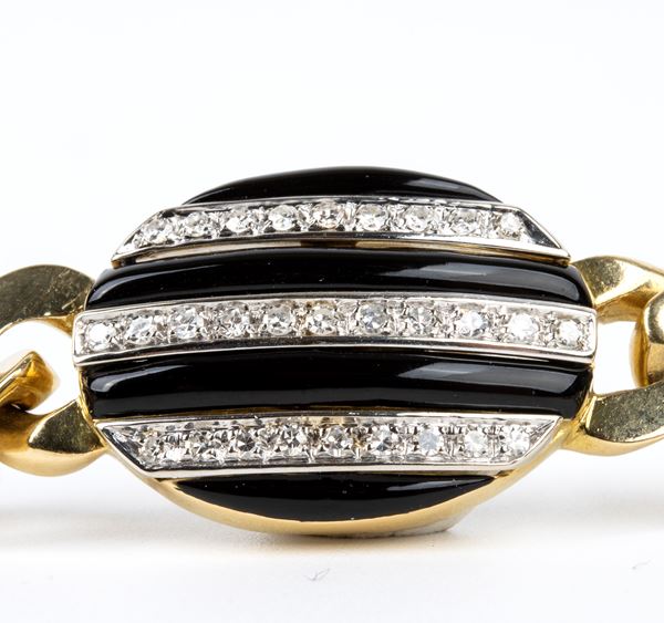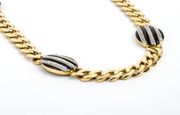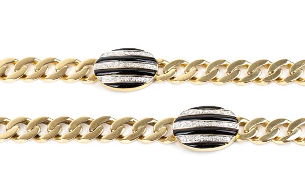 18k yellow gold groumette chain, interrupted by two colour gold elements set with three rows of diamonds and decorated with black enamel.