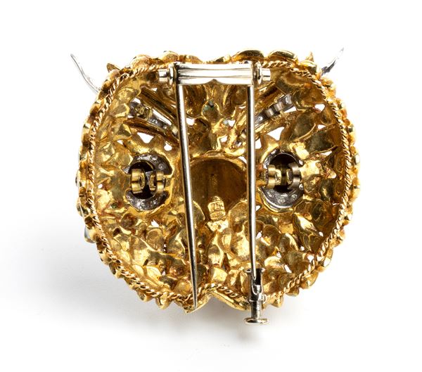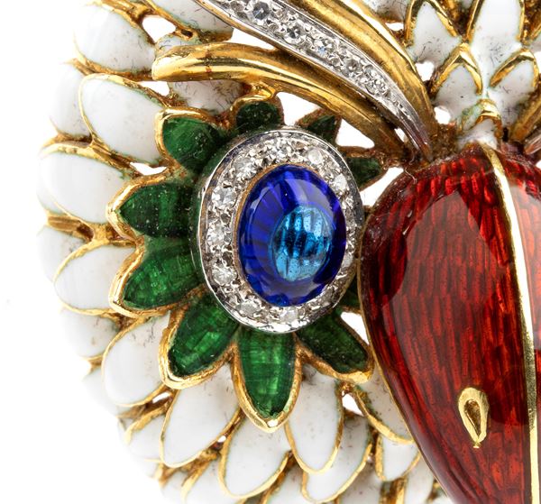 in 18k yellow gold, featuring the head of an howl with layering of polychrome enamels, including white for the feathers, red for the beak, and green and blue for the eyes, diamond details.