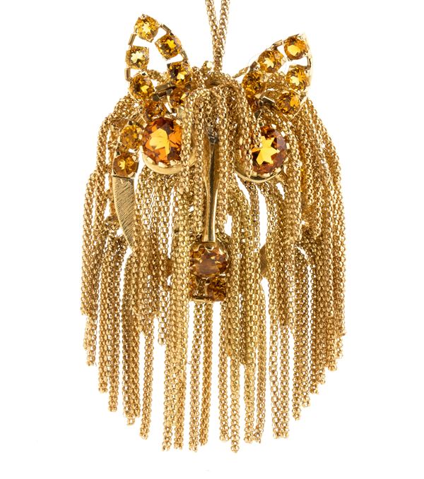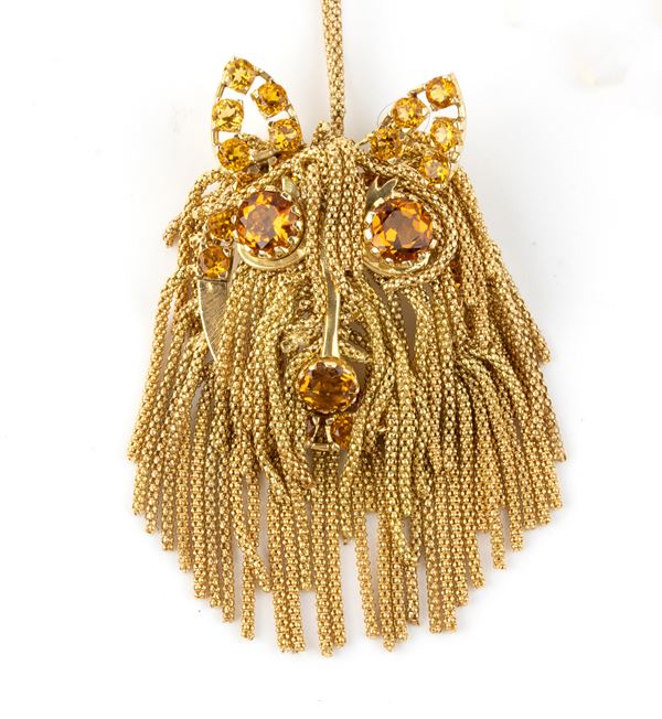 gold-plated sterling silver chain with citrine quartz drops, 18k gold pendant in the shape of a dog's head, citrine quartz details.