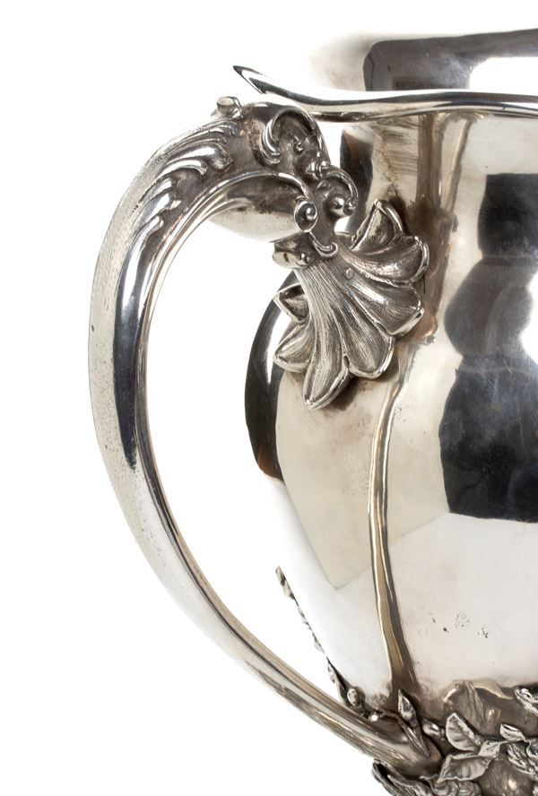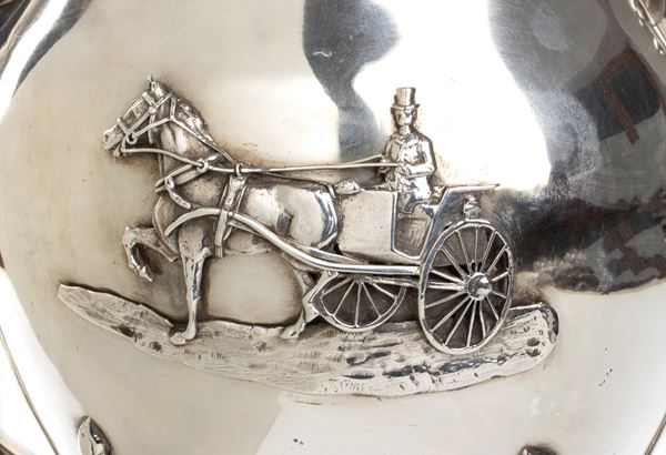 On a stepped domed base with wavy rim applied with climbing flowers and foliage, the body applied on one side with a horse pulling a carriage, the opposite side engraved with a presentation inscription, the leaf-capped loop handles with flower blossom upper terminals.