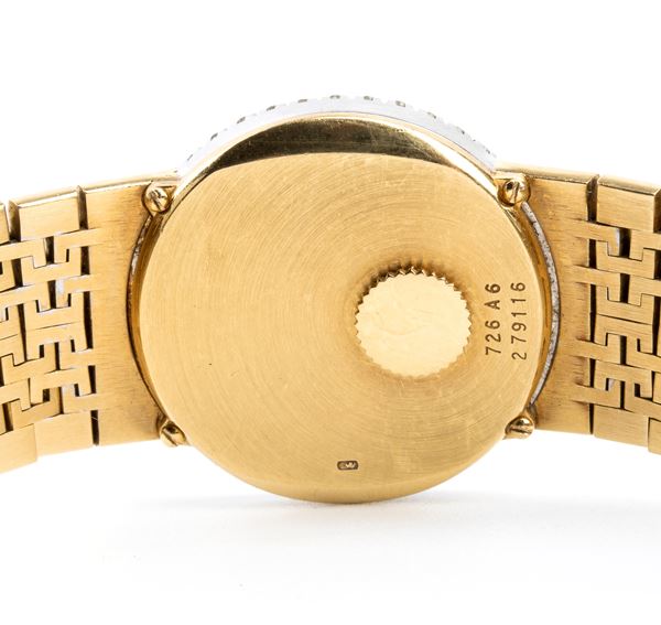 Yellow gold case, blue dial with gilded gladius spheres and brilliant-cut diamond bezel. Quartz movement.