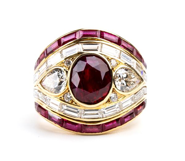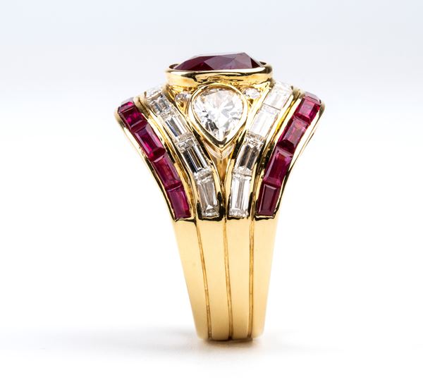 18k yellow gold, embellished by rubies and diamonds; central ruby, Burma origin.