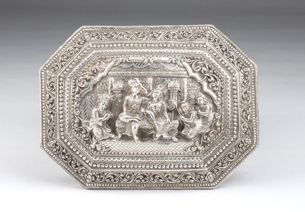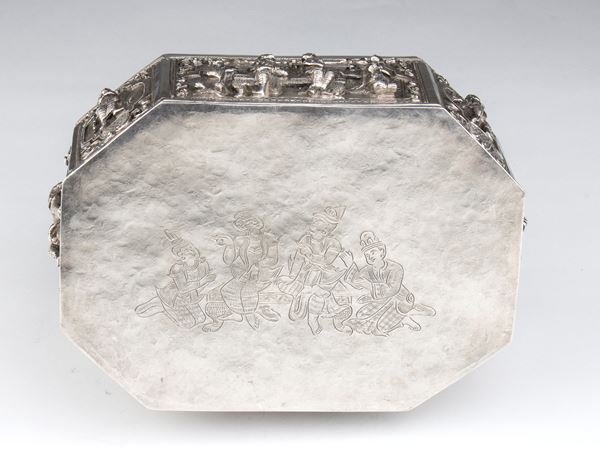 embossed and chiselled with figures from Burmese tradition, the lid with plug-in closure.