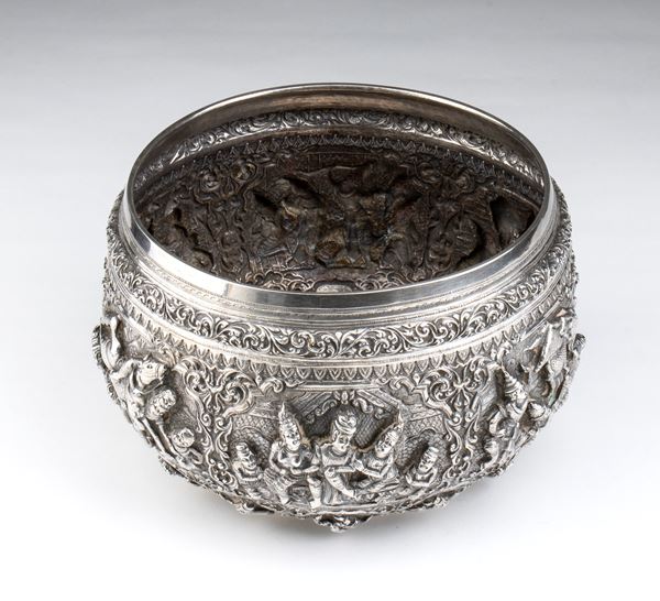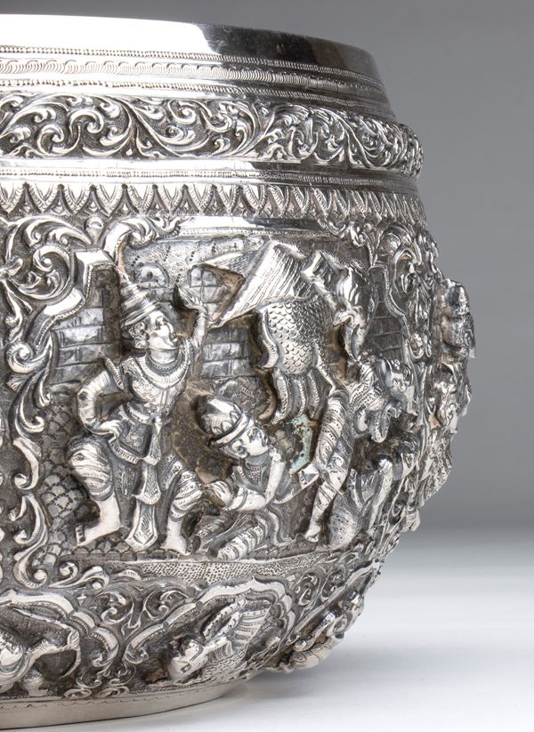 of circular form, the body richly embossed and chiseled with traditional scenes from Burmese mythology and adorned with numerous decorations.