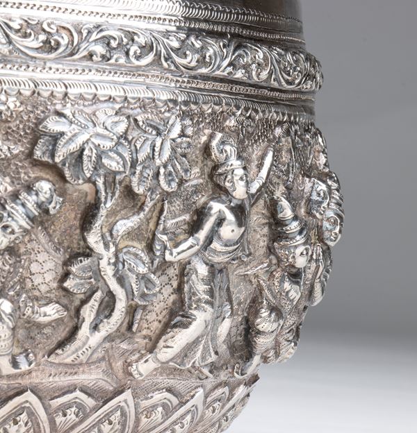 of circular form, the body richly embossed and chiseled with traditional scenes from Burmese mythology and adorned with numerous decorations.