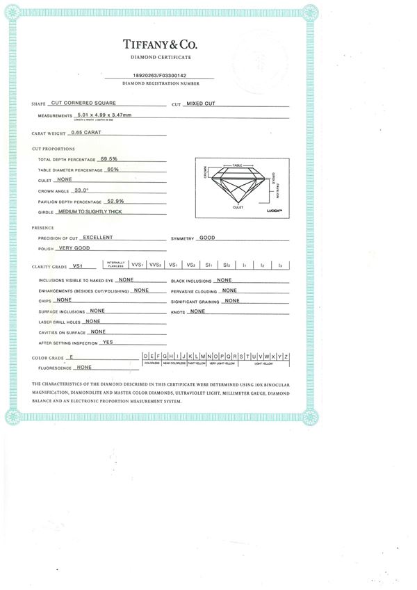 Hallmarked "1999 - TIFFANY & Co - Lucida - PT 950 - 1980 MI - Pat 5970744 et al - 18920263 - .65CT".