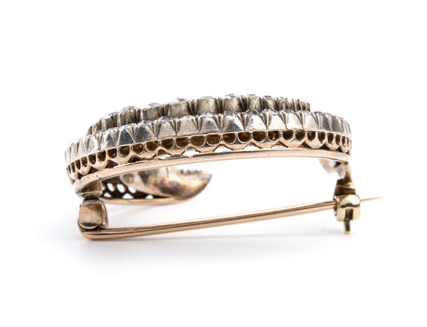 this enchanting brooch features a crescent moon, set with glittering old cut diamonds.
