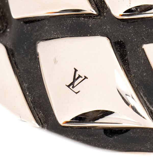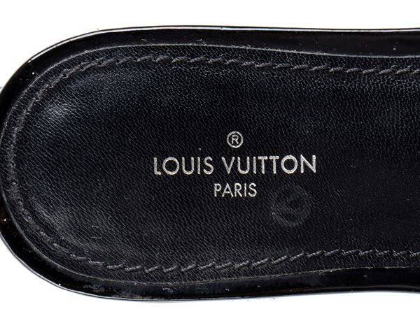 Low mules in black leather, decorated with silver motifs and the highlighted Louis Vuitton logo. Size 36