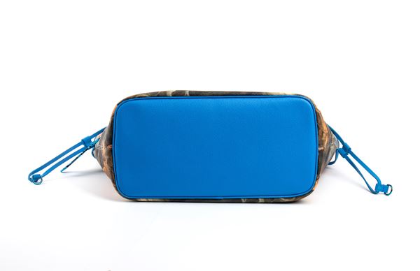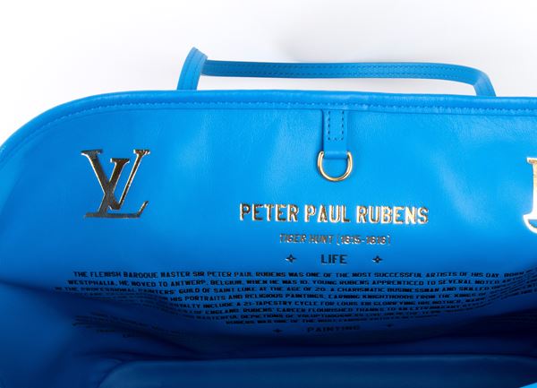 Louis Vuitton Neverfull MM limited edition Jeff Koons Master Collection Rubens, the shopping bag is made of canvas with pattern and blue leather, inserts in golden metal, double handle in blue leather allowing the bag to be carried by hand or worn on the shoulder, with internal lining in blue leather, a zip pocket, a double patch pocket, a removable zip pouch, the clasp closure at the top, with dustbag and box.