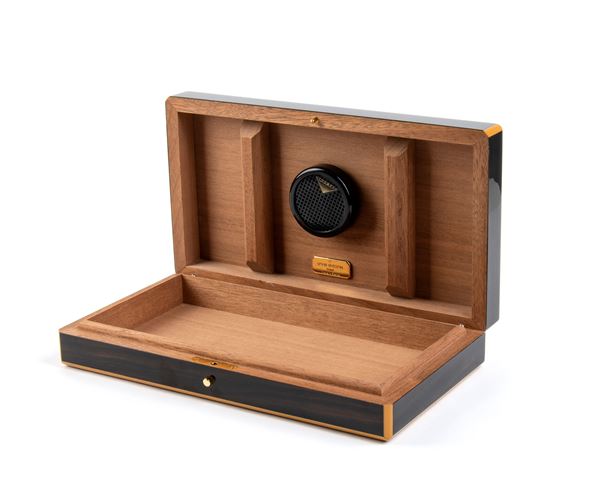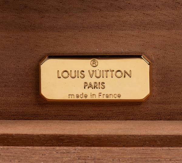 Louis Vuitton travel cigar case, created in mahogany and embellished with an elegant ebony Macassar finish and a Monogram inlay in pear wood, golden metal parts, humidifier inside.